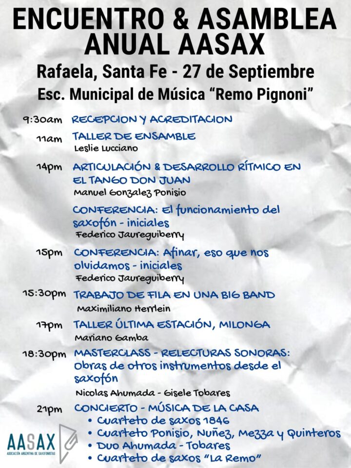 Compartimos la grilla de actividades del próximo encuentro: Encuentro: AASAX en RAFAELA (Santa Fe)27 y 28 de septiembre – 🕘 9:00 hs – Escuela Municipal de Música “Remo Pignoni” – Rafaela, Santa Fe En el marco del Encuentro anual de la AASAX, y en la querida Remo, la cita busca potenciar la escena del saxofón […]
