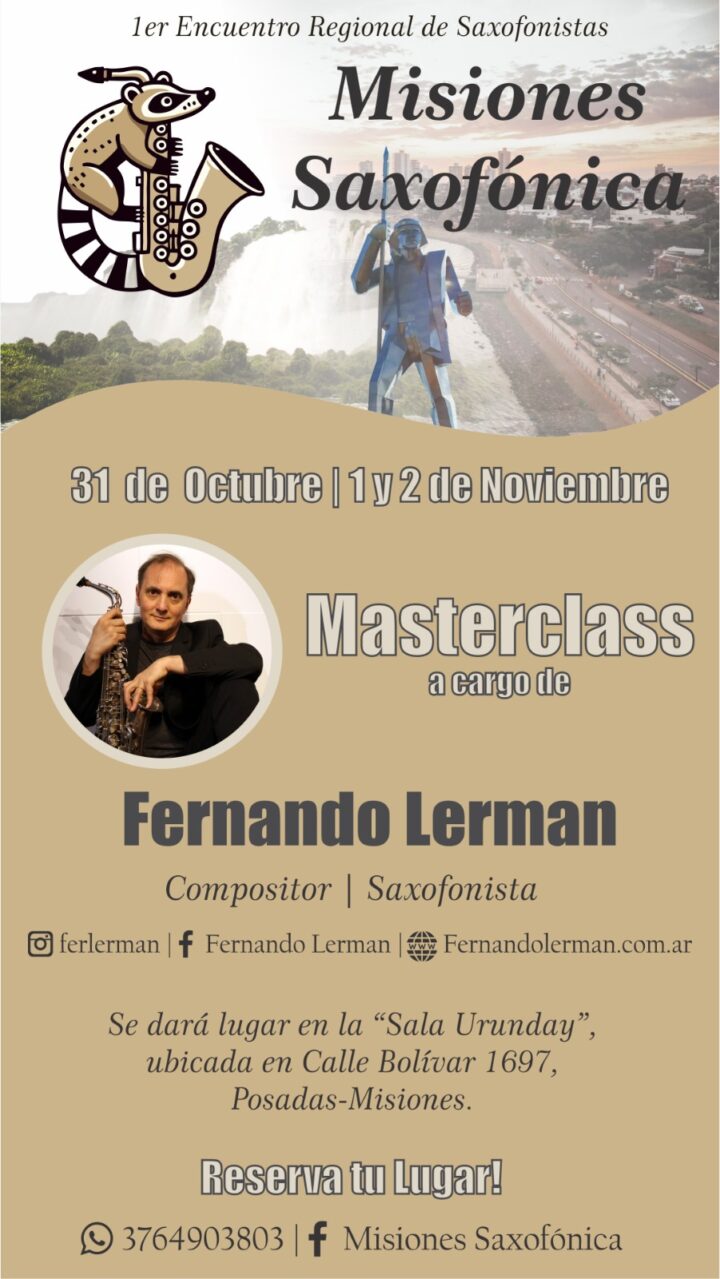 Misiones Saxofónica! Comments are closed 1° Encuentro Regional de Saxofonistas – Misiones Saxofónica! 31/10 – 1 y 2/11 en Posadas Misiones // Sala Urunday (Bolívar 1697) Masterclass a cargo de Fernando Lerman Reserva tu lugar al 3764903803 Read More